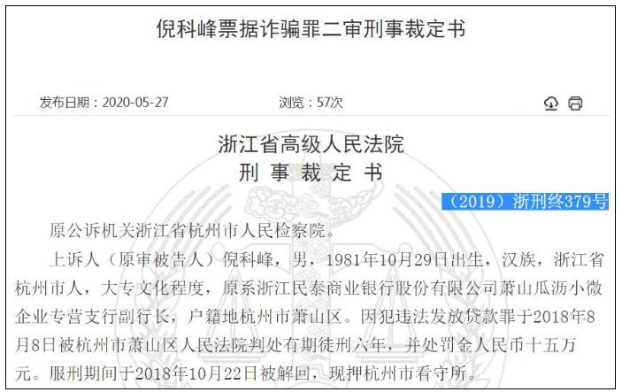 支行领导背后撑腰 浙江民泰银行萧山支行被骗贷1.4亿