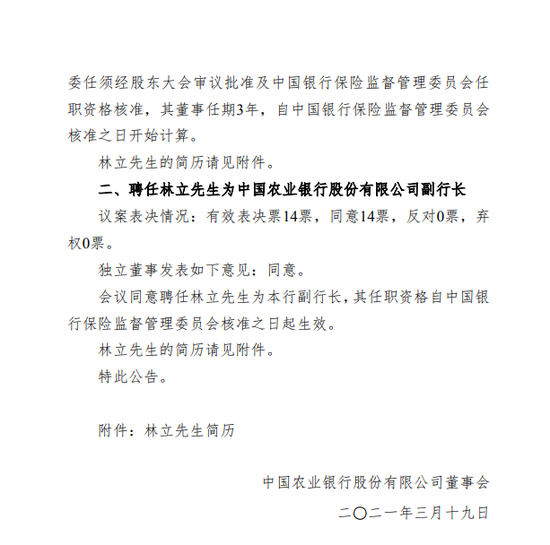 农业银行:提名刘晓鹏、肖翔为非执行董事候选人