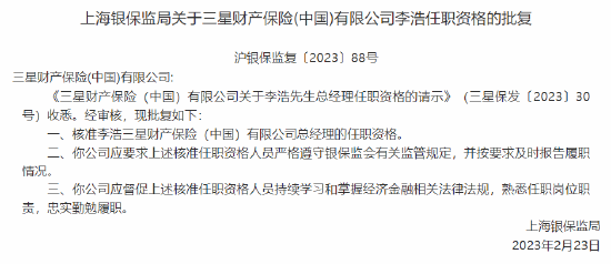 李浩出任三星财险总经理资格获批