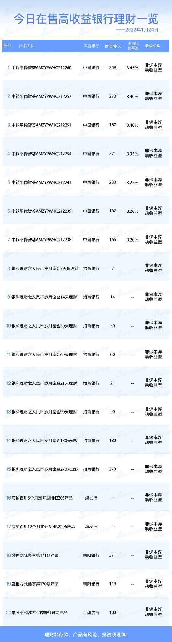 •   新浪财经1月24日在售高收益银行理财产品一览:今日业绩比较基准在3.20%及以上的银行人民币理财产品共7款。理财非存款、产品有风险、投资须谨慎!