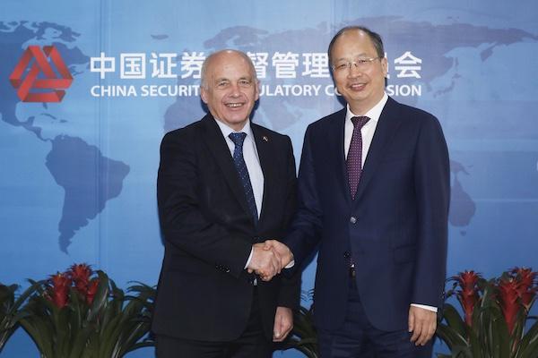 2019年4月25日下午,中国证监会主席易会满会见了到访的瑞士联邦主席兼财政部长于利·毛雷尔(Ueli Maurer)一行。双方同意务实推进中瑞两国在金融市场、行业、监管机构等多领域的互利合作,共同提升双方在绿色金融、科技监管、跨境执法等方面的能力水平。
