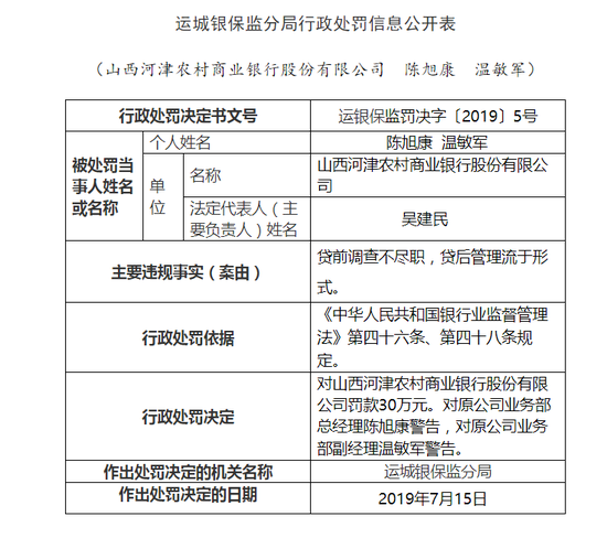 •   中国金融网讯 山西运城银保监分局近日公布关于山西河津农村商业银行股份有限公司的行政处罚信息。山西河津农村商业银行股份有限公司存在贷前调查不尽职,贷后管理流于形式。运城银保监分局决定对山西河津农村商业银行股份有限公司罚款30万元。对原公司业务部总经理陈旭康警告,对原公司业务部副经理温敏军警告。