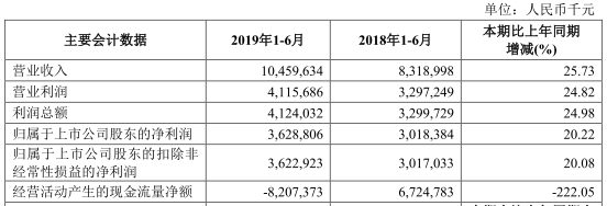 •   中国经济网北京8月29日 (记者 魏京婷)杭州银行(600926.SH)27日晚间发布2019年半年度报告。今年上半年,杭州银行实现营业收入104.60亿元,同比增长25.73%;实现归属于上市公司股东的净利润36.29亿元,同比增长20.22%;经营活动产生的现金流量净额为-82.07亿元,同比减少222.05%。