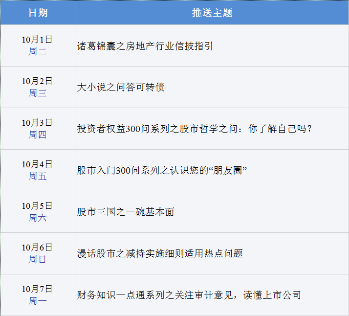 国庆长假期间,深交所还将通过今日头条和雪球网的“深交所投教基地”新媒体号,进行“2019年世界投资者周”特别推送。具体安排如下: