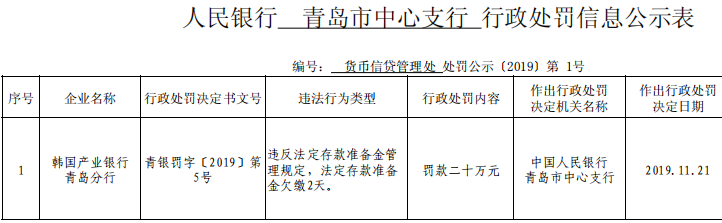 韩国产业银行青岛分行违法遭罚 法定存款准备金欠缴