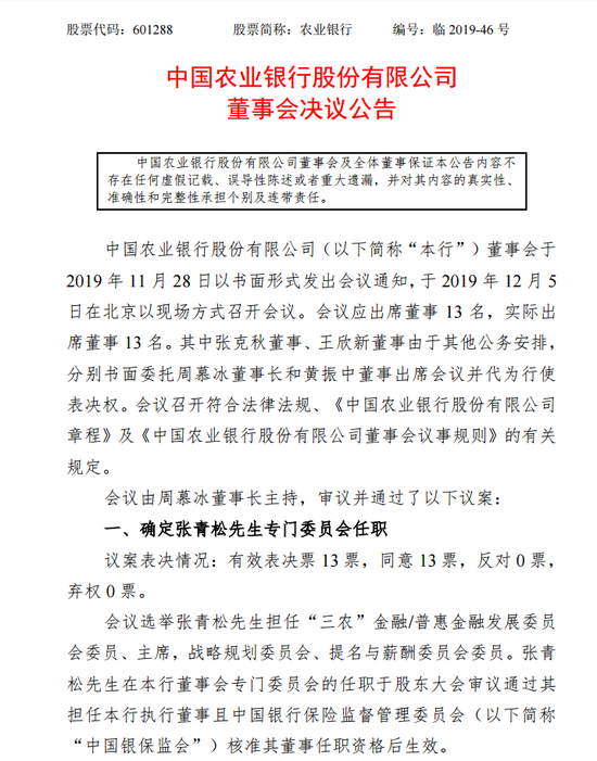 农业银行:董事会秘书韩国强任职资格获银保监会核准