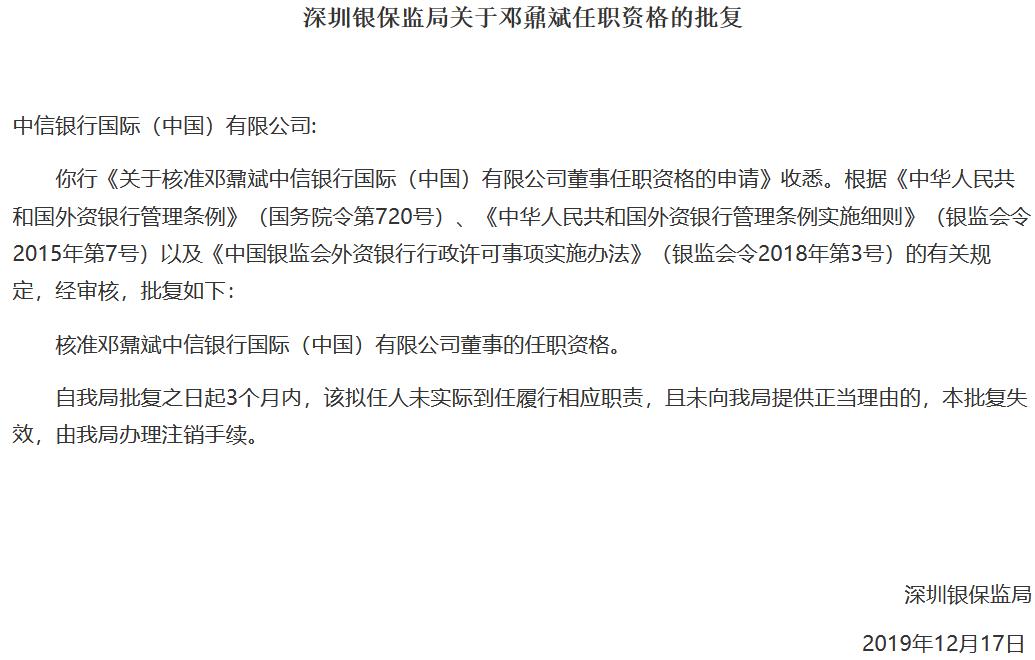 中信银行国际(中国)董事邓鼐斌任职资格获准