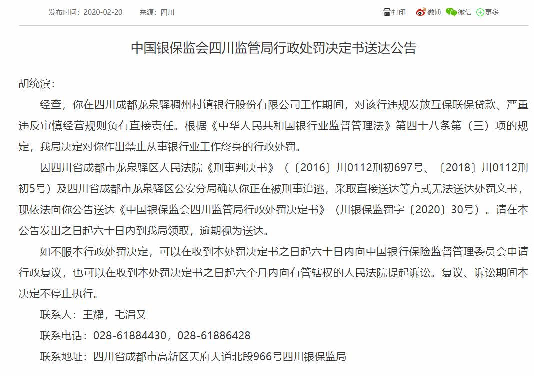 龙泉驿稠州银行原行长胡统滨遭终身禁业 因违规遭除名