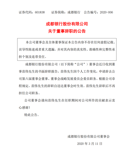 渝农商行非执行董事罗宇星因个人工作需要辞职