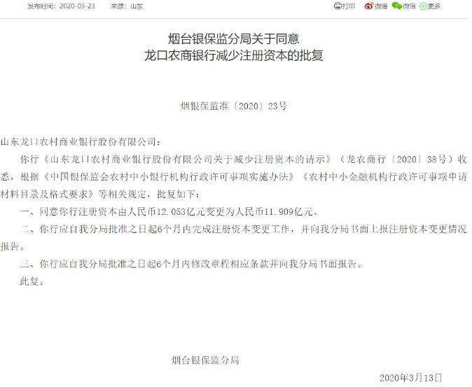 •   和讯银行:3月23日,烟台银保监局批复同意《山东龙口农商银行关于减少注册资本的请示》,龙口农商银行注册资本将由12.053亿元变更为11.909亿元。
