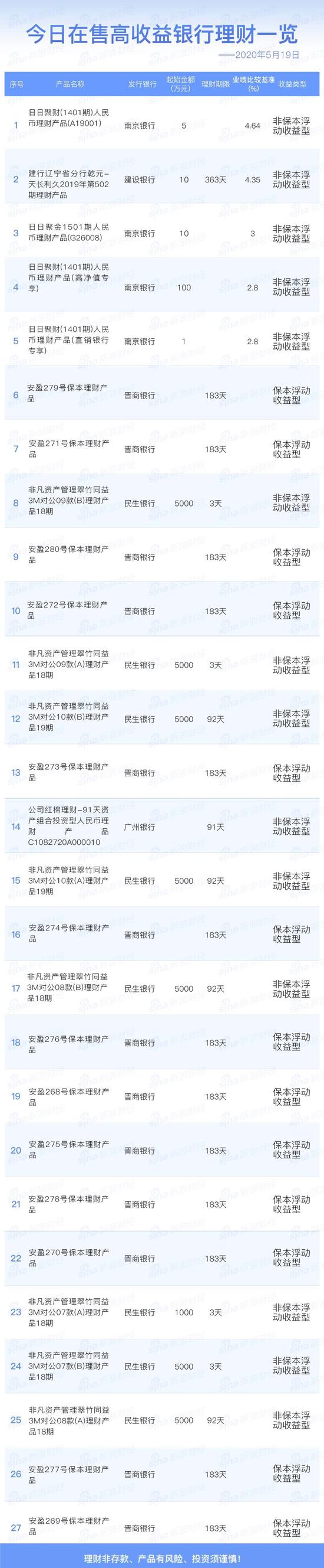 •   新浪财经消息:5月19日在售高收益银行理财产品:今日业绩比较基准在4.6%以上的银行人民币理财产品共1款。南京银行的“日日聚财(1401期)人民币理财产品(A19001)”业绩比较基准最高,为4.64%。