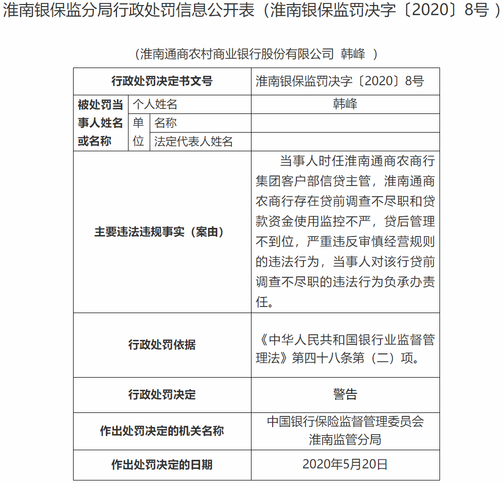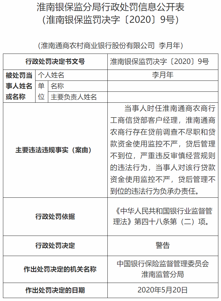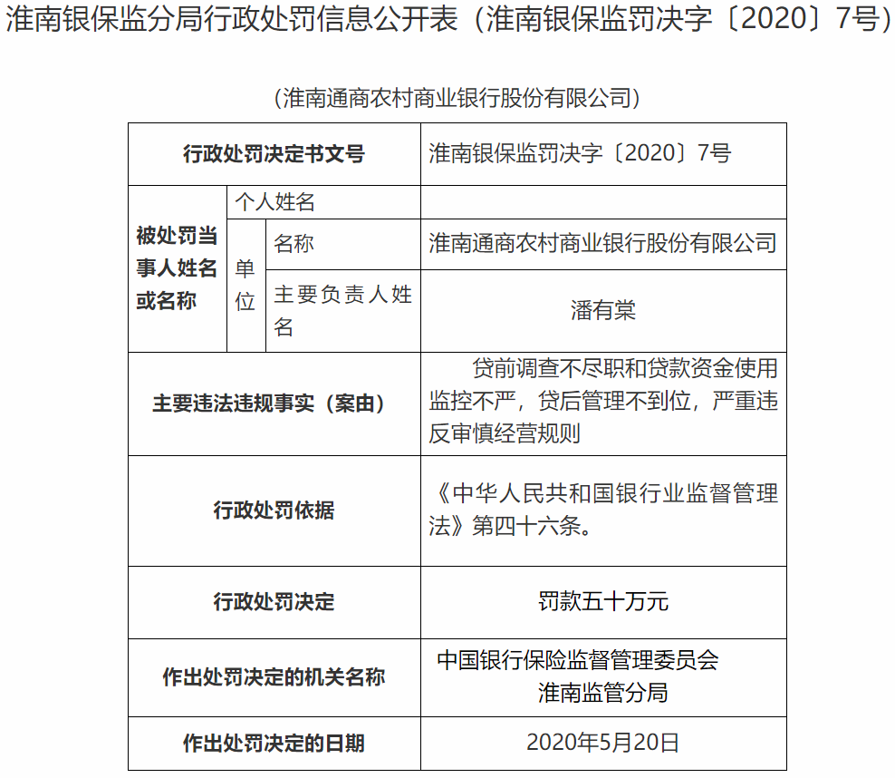 淮南通商农商行违规贷款被罚
