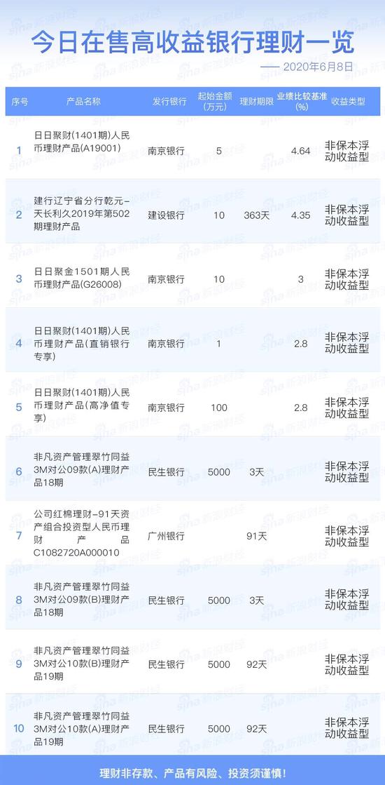 •   新浪财经消息:6月8日在售高收益银行理财产品:今日业绩比较基准在4.6%以上的银行人民币理财产品共1款。南京银行的“日日聚财(1401期)人民币理财产品(A19001)”业绩比较基准最高,为4.64%。