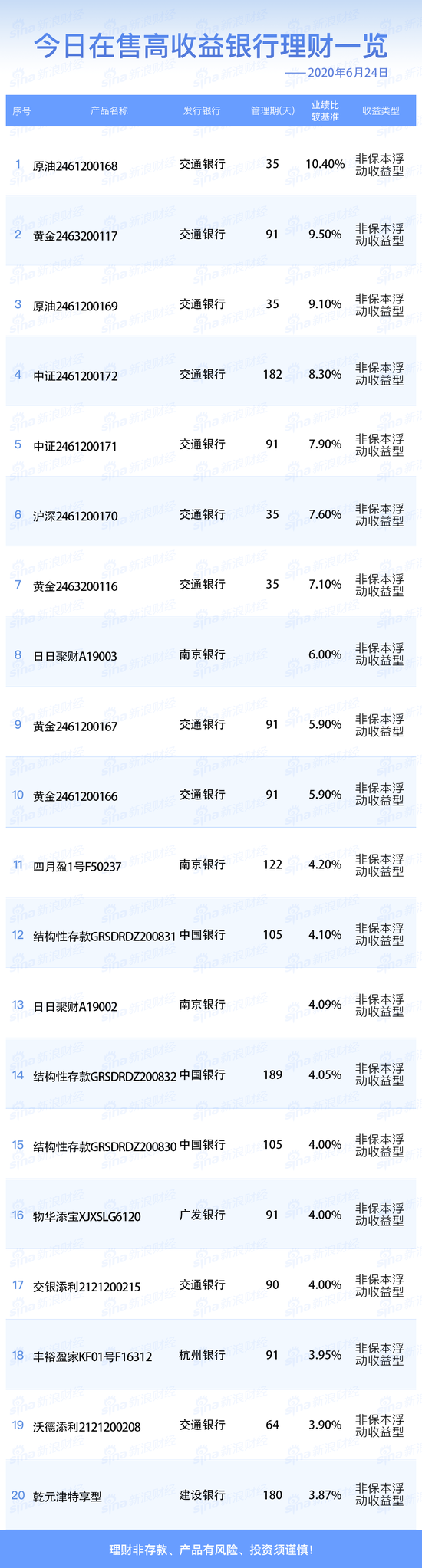 •   新浪财经消息    6月24日在售高收益银行理财产品:今日业绩比较基准在9%以上的银行人民币理财产品共3款。交通银行的“原油2461200168”业绩比较基准最高,为10.40%。