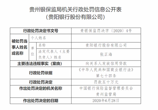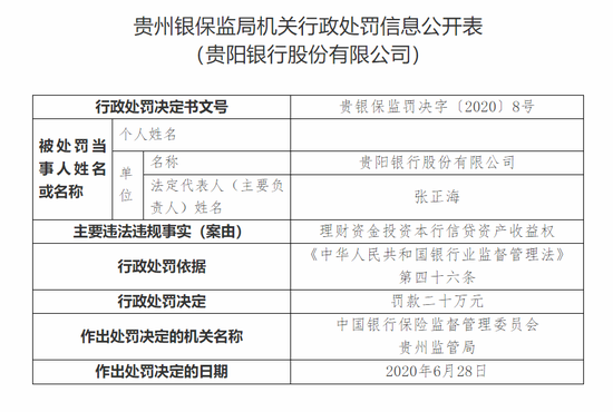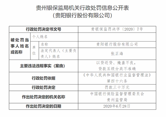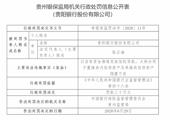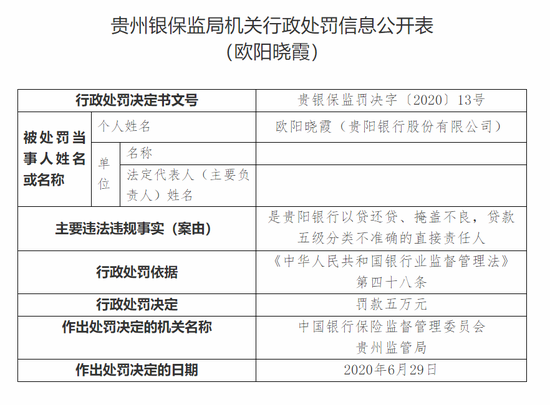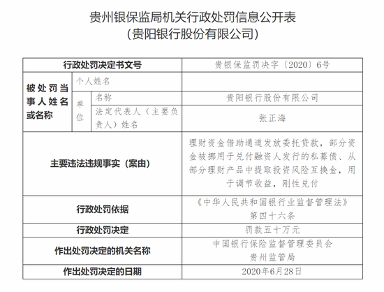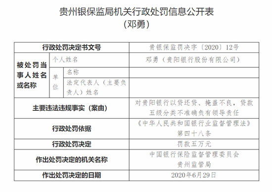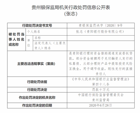 其中,贵阳银行理财资金借助通道发放委托贷款,部分资金被挪用于兑付融资人发行的私募债、从部分理财产品中提取投资风险互换金,用于调节收益,刚性兑付的直接责任人张志被罚款十万元;贵阳银行以贷还贷、掩盖不良,贷款五级分类不准确的直接责任人欧阳晓霞被罚款五万元;邓勇对贵阳银行以贷还贷、掩盖不良,贷款五级分类不准确负有领导责任,被罚款五万元。