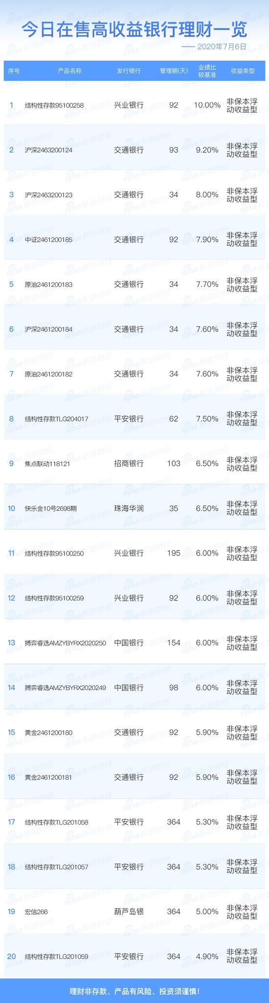 银行7月6日在售高收益理财产品