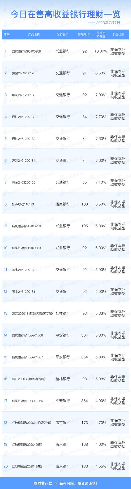 •   新浪财经消息    7月7日在售高收益银行理财产品:今日业绩比较基准在8%以上的银行人民币理财产品共2款。兴业银行的“结构性存款95100258”业绩比较基准最高,为10.00%。