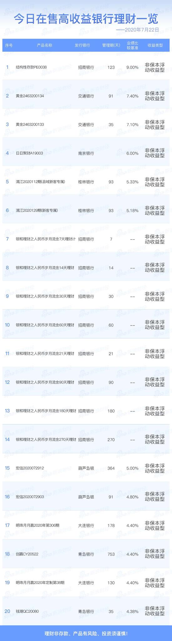 •   新浪财经消息    7月22日在售高收益银行理财产品:今日业绩比较基准在9.0%及以上的银行人民币理财产品共1款。招商银行的“结构性存款PE0038”业绩比较基准最高,为9.00%。