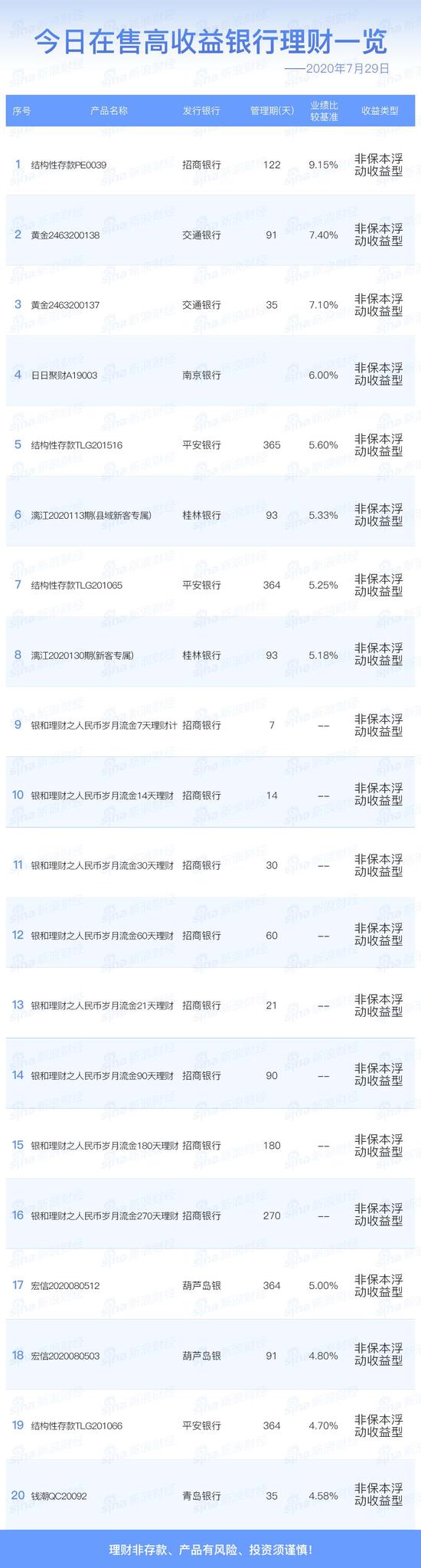 •   新浪财经消息   7月29日在售高收益银行理财产品:今日业绩比较基准在8.0%及以上的银行人民币理财产品共1款。招商银行的“结构性存款PE0039”业绩比较基准最高,为9.15%。