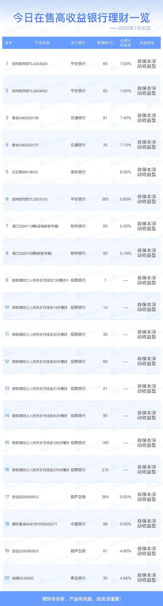 银行7月30日在售高收益理财产品