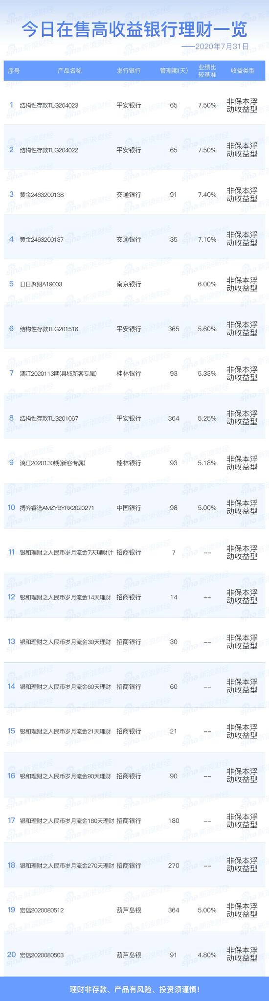 •   新浪财经消息  7月31日在售高收益银行理财产品:今日业绩比较基准在7.00%及以上的银行人民币理财产品共4款。平安银行的“结构性存款TLG204023”和“结构性存款TLG204022”业绩比较基准最高,同为7.50%。