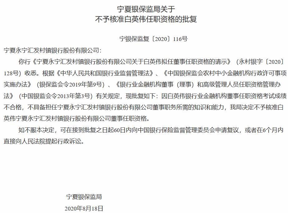 公告显示,因白英伟银行业金融机构董事任职资格考试成绩不合格,不具备担任宁夏永宁汇发村镇银行董事职务所需的知识和能力,宁夏银保监局决定不予核准白英伟宁夏永宁汇发村镇银行董事任职资格。