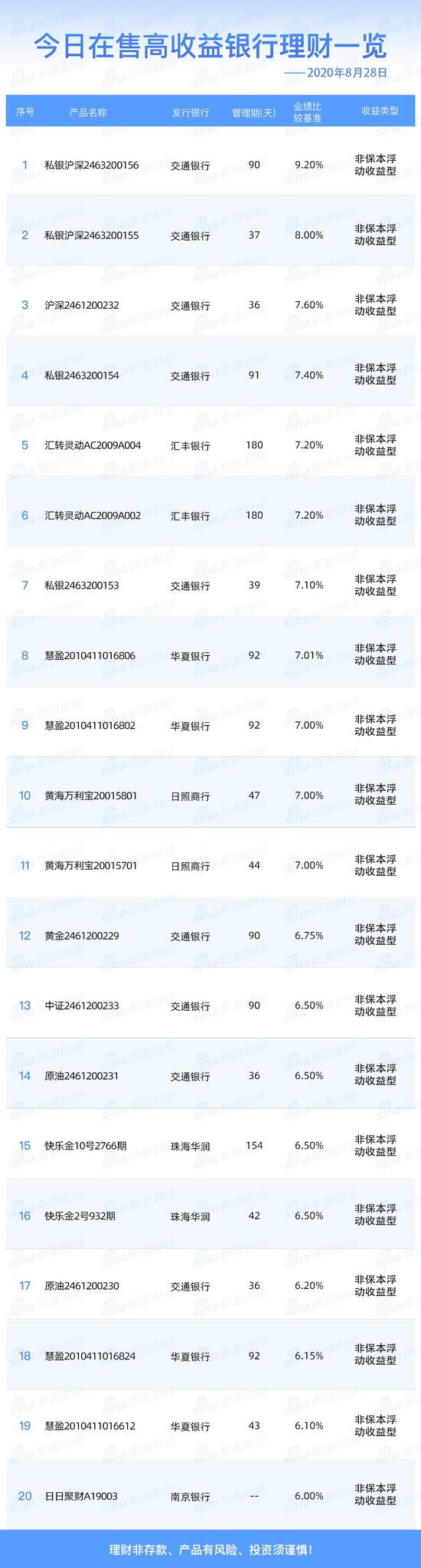 •   新浪财经8月28日在售高收益银行理财产品:今日业绩比较基准在7.00%及以上的银行人民币理财产品共11款。交通银行的“私银沪深2463200156”业绩比较基准最高,为9.20%。
