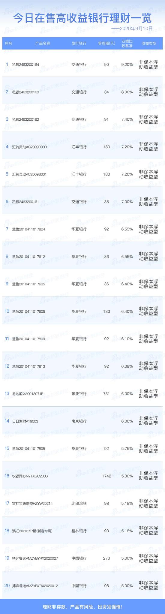 •   9月10日在售高收益银行理财产品:今日业绩比较基准在8.00%及以上的银行人民币理财产品共2款。交通银行的“私银2463200164”业绩比较基准最高,为9.20%。