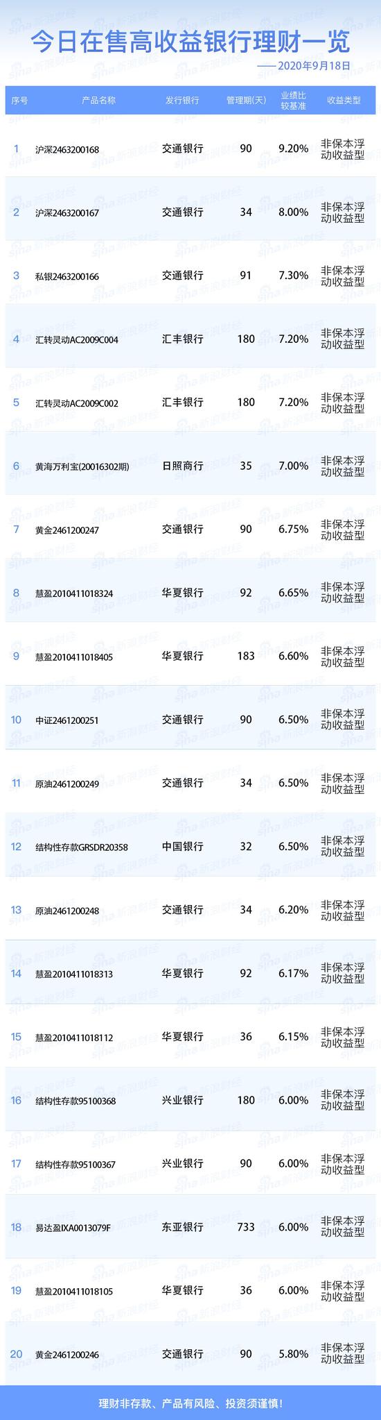 9月18日在售高收益银行理财产品:今日业绩比较基准在8.00%及以上的银行人民币理财产品共2款。交通银行的“沪深2463200168”业绩比较基准最高,为9.20%。