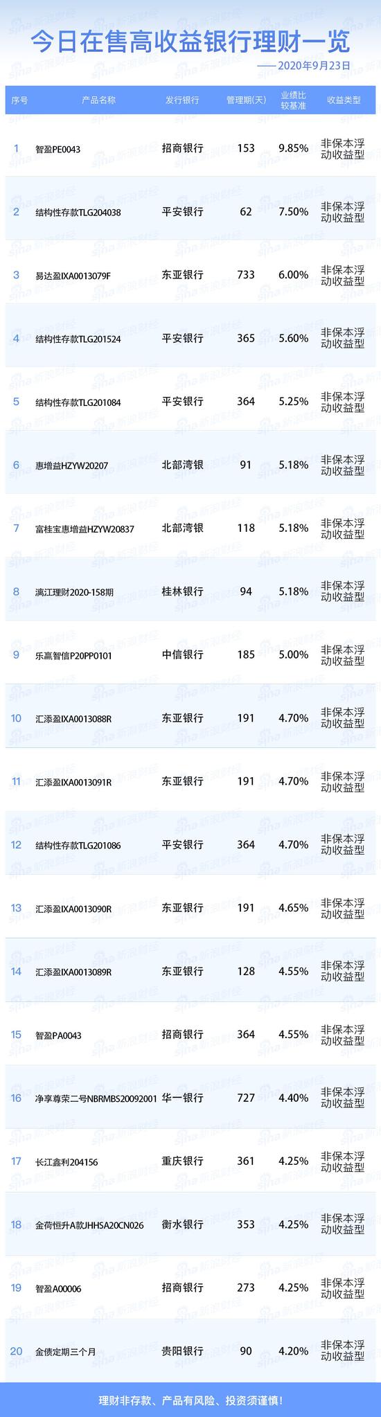 银行9月23日在售高收益理财产品