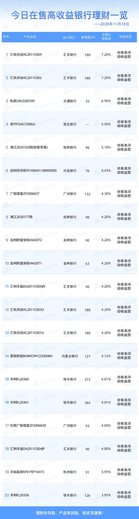 •   11月18日在售高收益银行理财产品:今日业绩比较基准在5%以上的银行人民币理财产品共5款。汇丰银行的“汇转灵动AC2011C004”业绩比较基准最高,为7.20%。