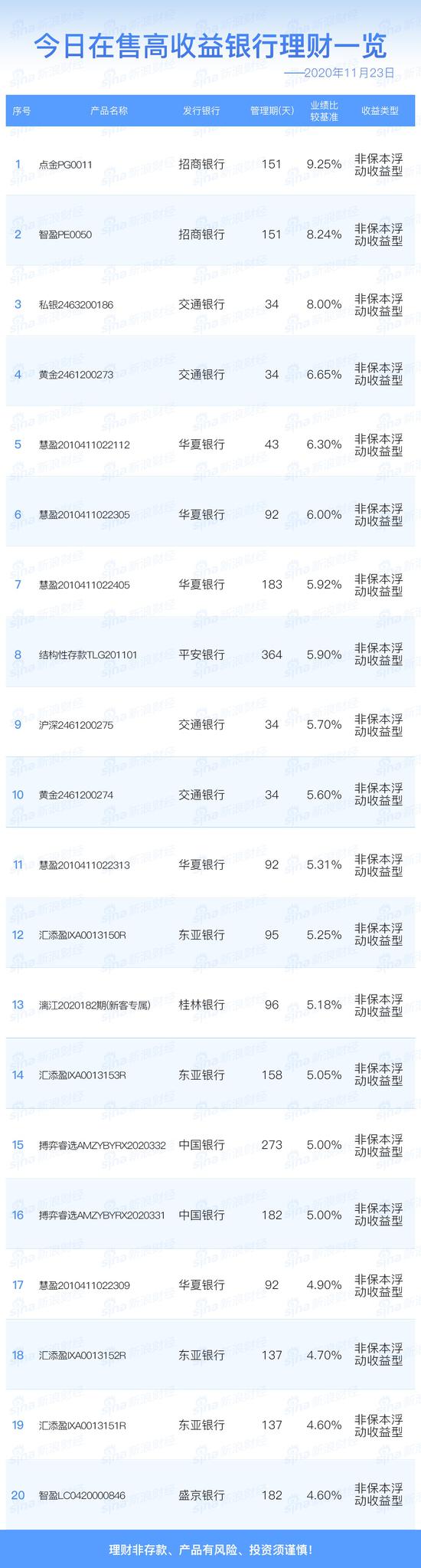 银行23日在售高收益理财产品一览