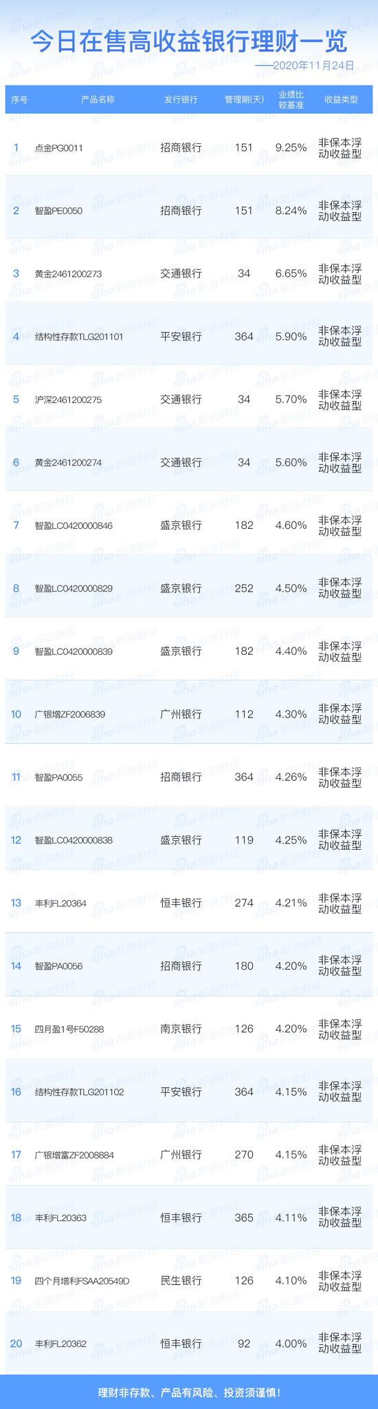 银行24日在售高收益理财产品一览