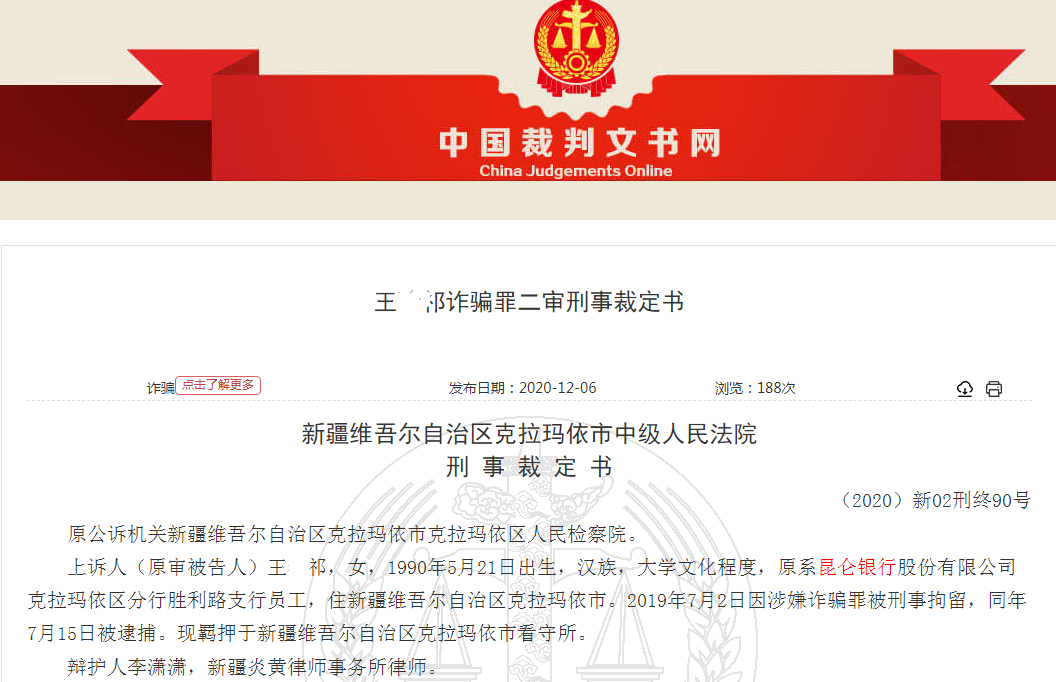 裁定书显示,当事人王某祁,女,1990年5月21日出生,汉族,大学文化程度,原系昆仑银行股份有限公司克拉玛依区分行胜利路支行员工,住新疆维吾尔自治区克拉玛依市。经审理查明,公诉机关指控,2016年5月至2019年6月期间,被告人王某祁利用银行工作人员身份,通过虚构能够帮助购买银行内部高额理财产品、办理银行免息贷款等方式,先后骗取被害人秦某、薛某及其亲友、范某、王某人民币229.9502万元(以下币种同)。具体事实如下: