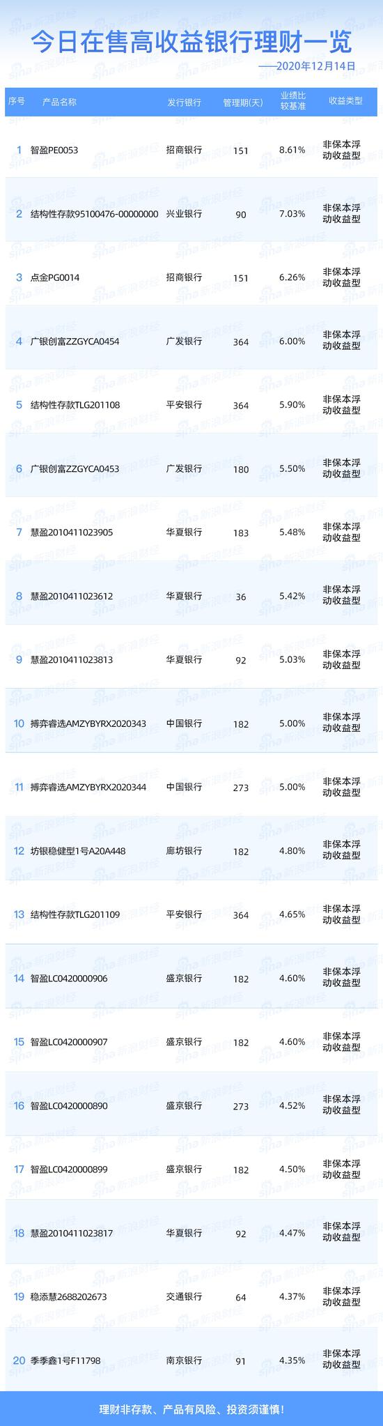 银行14日在售高收益理财产品一览