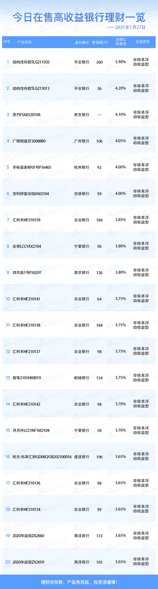 银行1月27日在售高收益理财产品