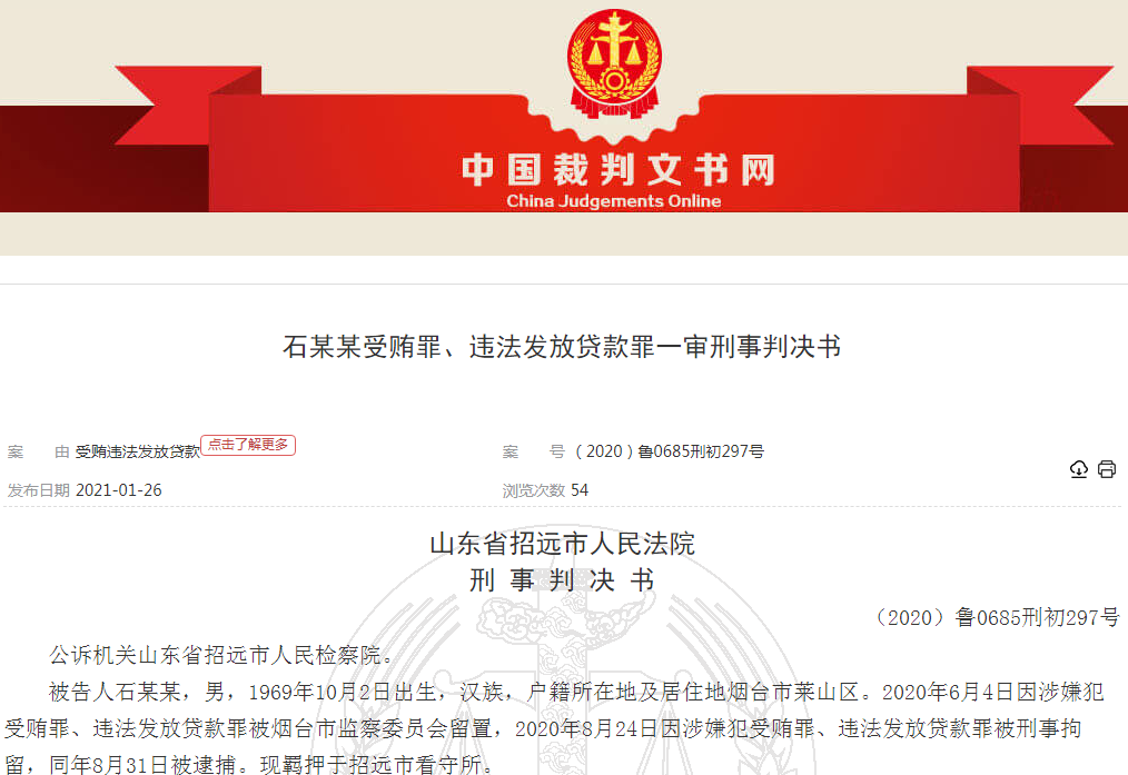 烟台银行原行长石学东被开除党籍、开除公职