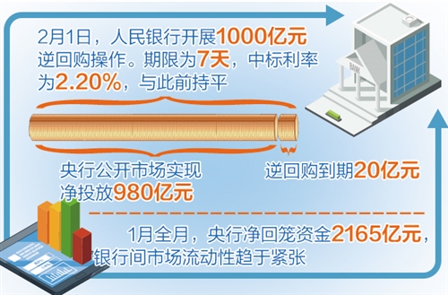 •   本报北京2月1日讯(记者姚进)中国人民银行今日发布公告称,为维护银行体系流动性合理充裕,人民银行以利率招标方式开展了1000亿元逆回购操作。期限为7天,中标利率为2.20%,与此前持平。由于1日有20亿元逆回购到期,央行公开市场实现净投放980亿元。