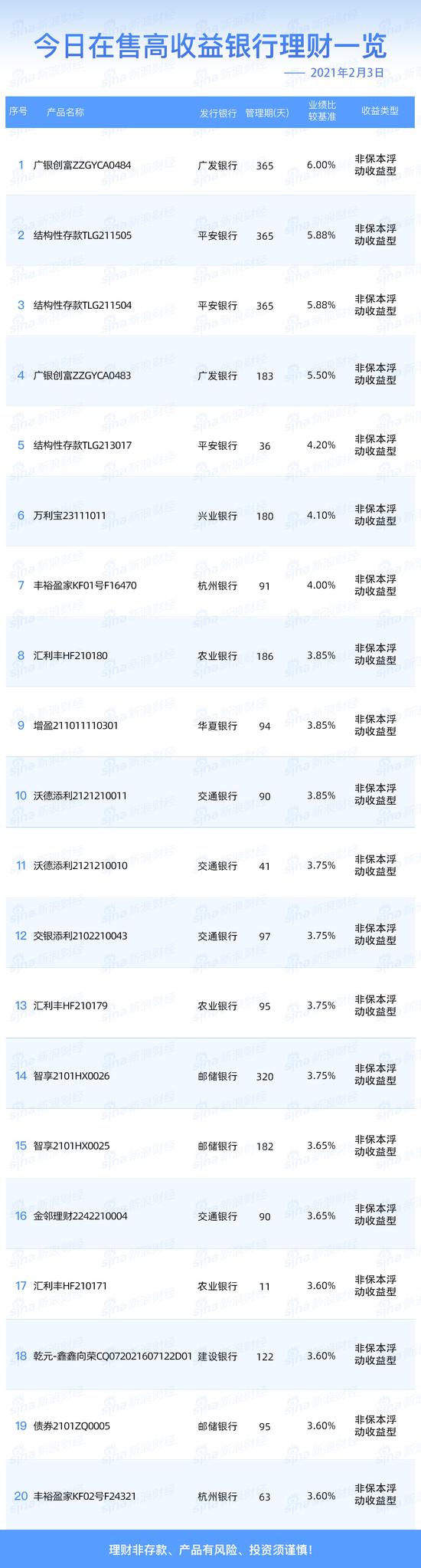 •   2月3日在售高收益银行理财产品:今日业绩比较基准在5%以上的银行人民币理财产品共4款。广发银行“广银创富ZZGYCA0484”业绩比较基准最高,为6.00%。
