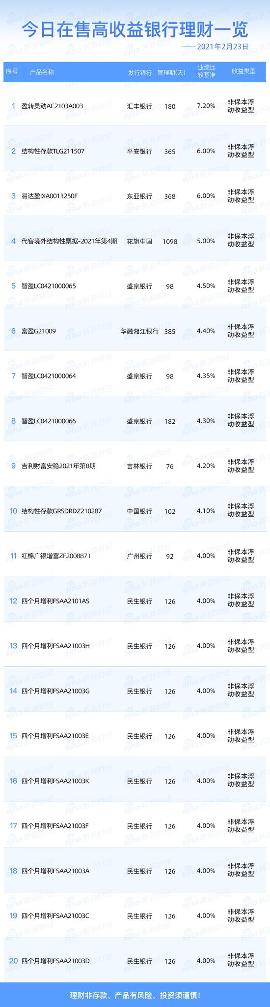 •   新浪财经2月23日在售高收益银行理财产品:今日业绩比较基准在5%以上的银行人民币理财产品共4款。汇丰银行“盈转灵动AC2103A003”业绩比较基准最高,为7.20%。