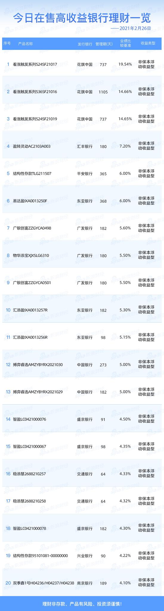 •   2月26日在售高收益银行理财产品:今日业绩比较基准在6%以上的银行人民币理财产品共6款。花旗中国“看涨触发系列S24SF21017”业绩比较基准最高,为19.54%。