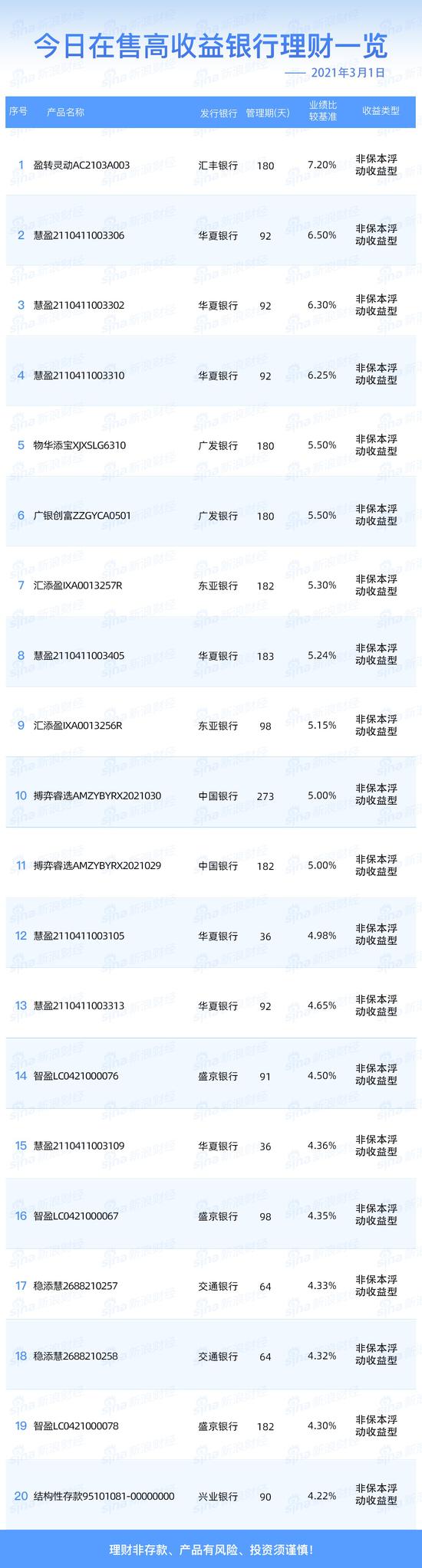 •   新浪财经3月1日在售高收益银行理财产品:今日业绩比较基准在6%以上的银行人民币理财产品共4款。汇丰银行“盈转灵动AC2103A003”业绩比较基准最高,为7.2%。