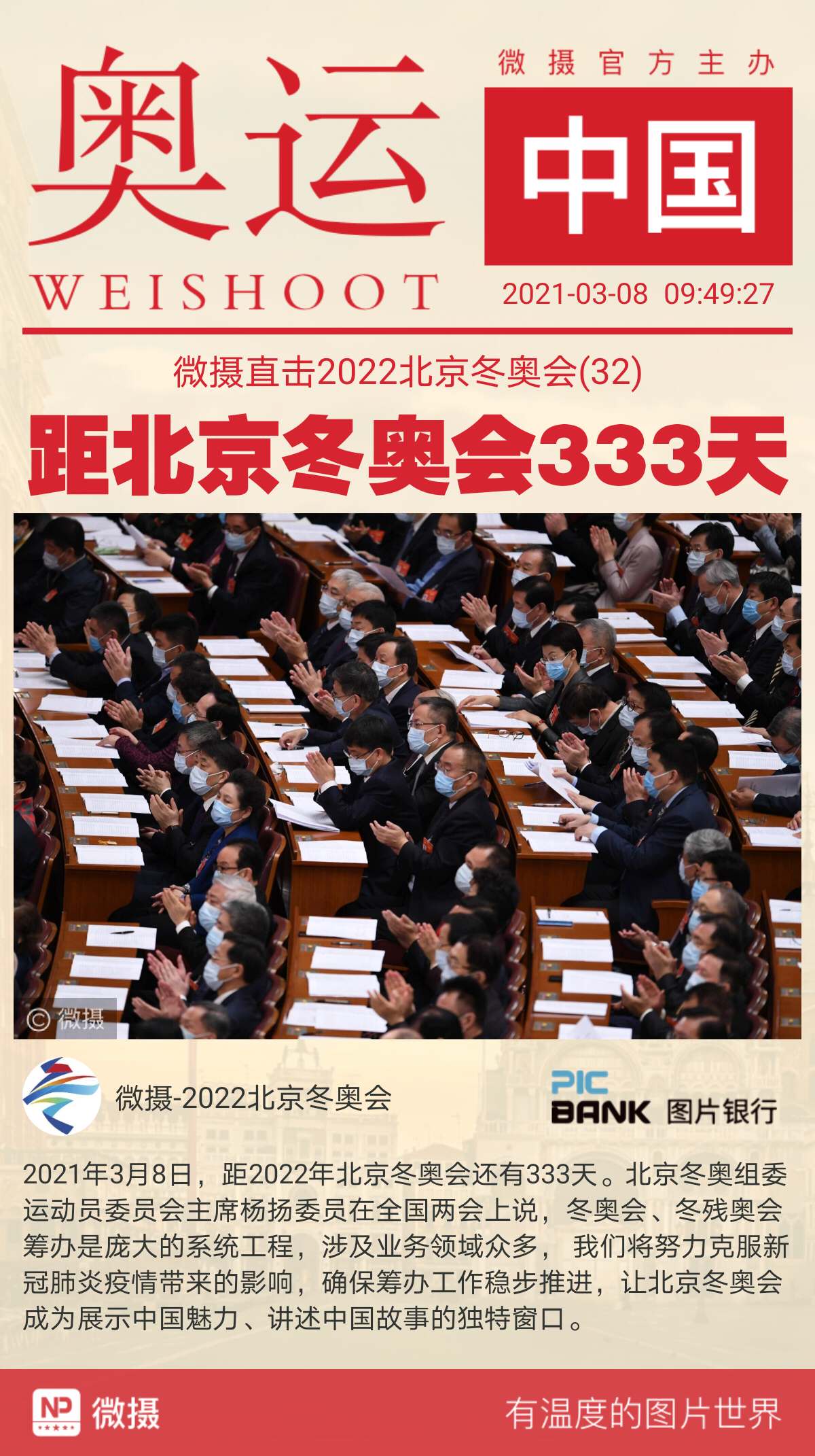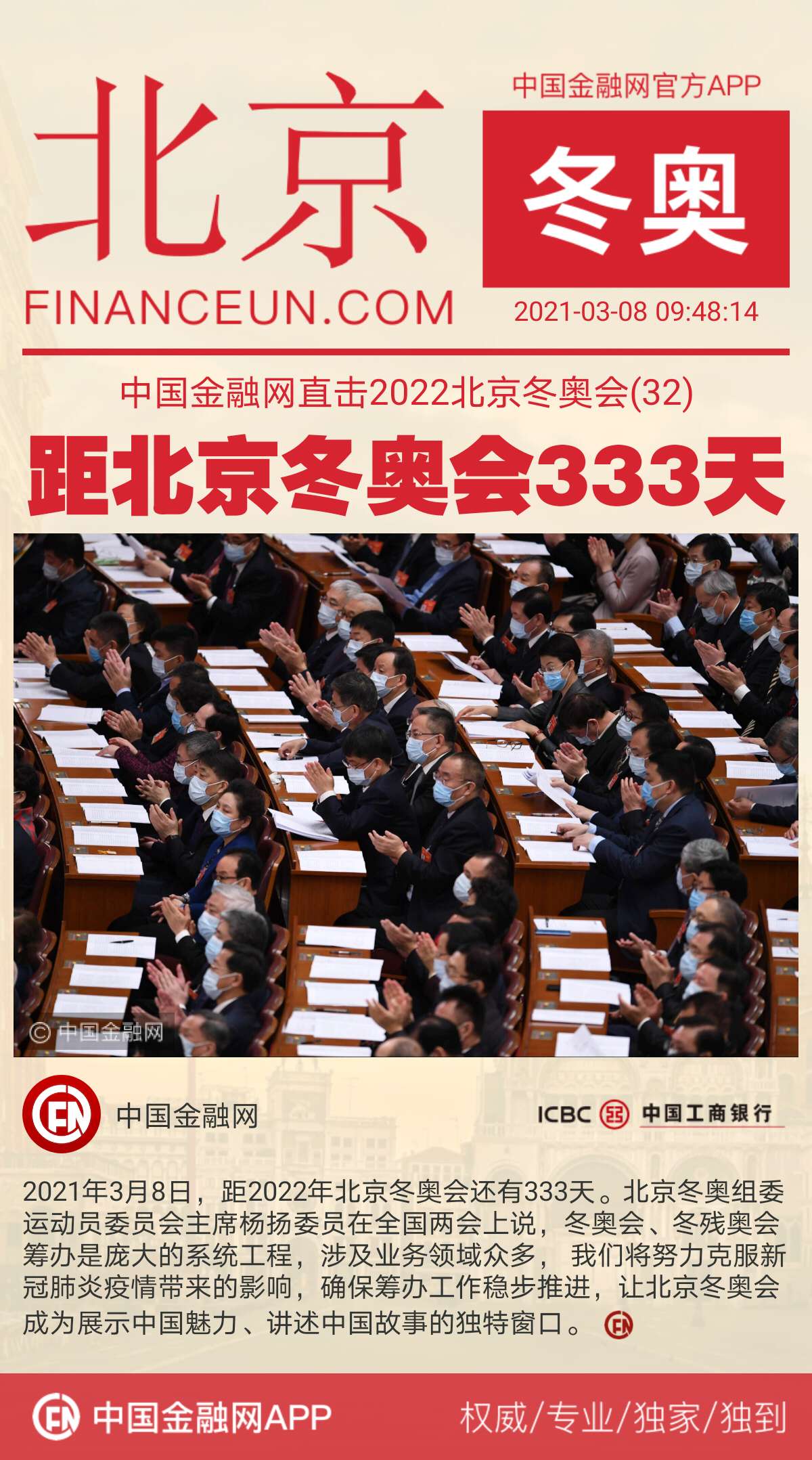 2021年3月8日,距2022年北京冬奥会还有333天。北京冬奥组委运动员委员会主席杨扬委员在全国两会上说,冬奥会、冬残奥会筹办是庞大的系统工程,涉及业务领域众多, 我们将努力克服新冠肺炎疫情带来的影响,确保筹办工作稳步推进,让北京冬奥会成为展示中国魅力、讲述中国故事的独特窗口。