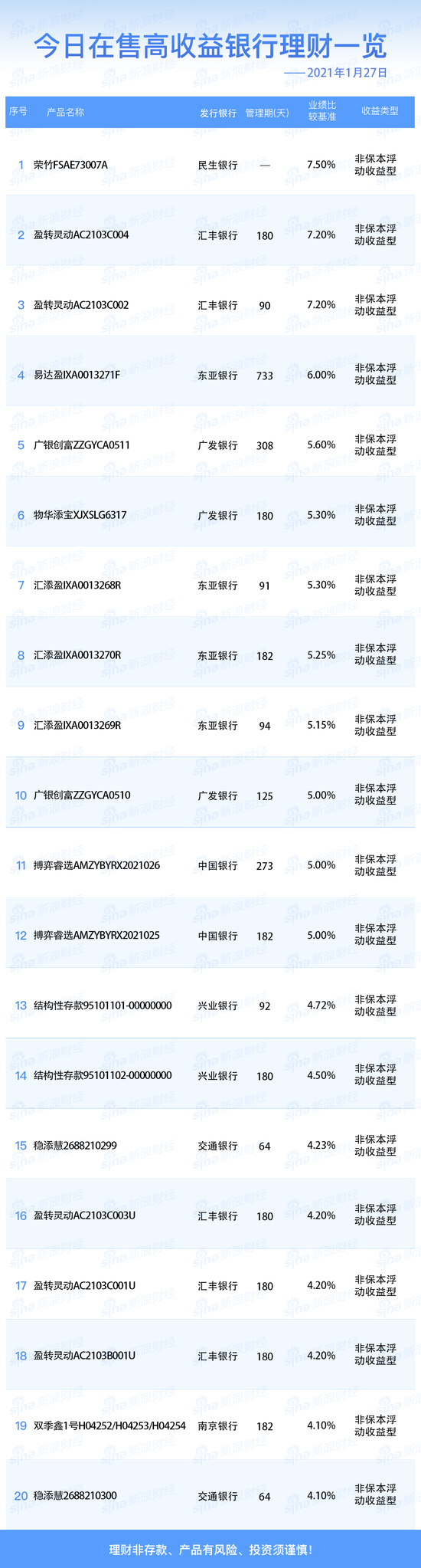 •   3月15日在售高收益银行理财产品:今日业绩比较基准在6%以上的银行人民币理财产品共4款。民生银行“在售荣竹FSAE73007A”业绩比较基准最高,为7.5%。