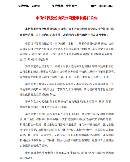 中信银行:李庆萍因工作安排原因辞去董事长等职务