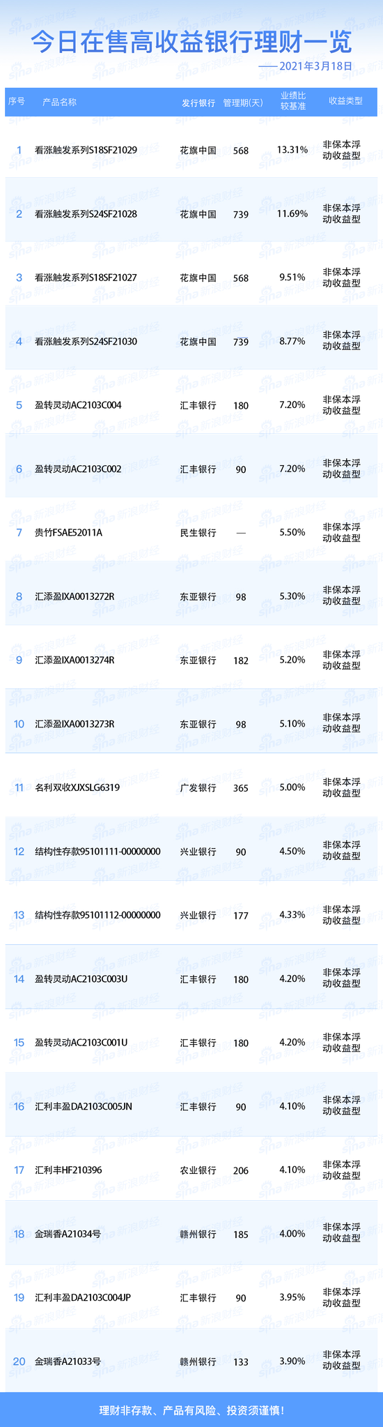 •   3月15日在售高收益银行理财产品:今日业绩比较基准在6%以上的银行人民币理财产品共6款。花旗中国“看涨触发系列S18SF21029”业绩比较基准最高,为13.31%。