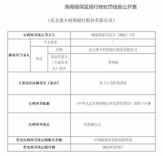 •   3月19日消息,海南银保监局公布的行政处罚信息公开表显示,东方惠丰村镇银行股份有限公司因员工行为管理薄弱,被处罚款30万元。