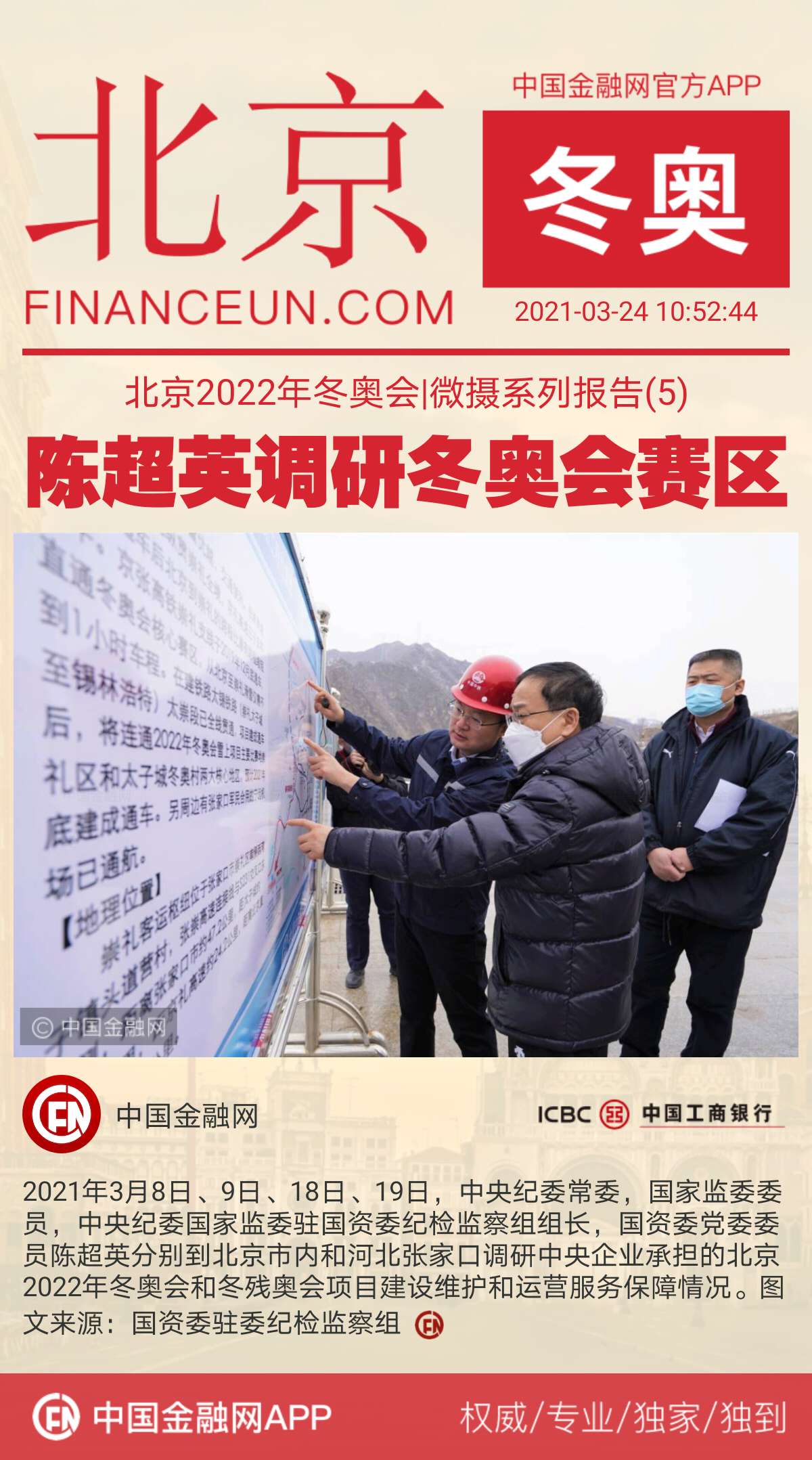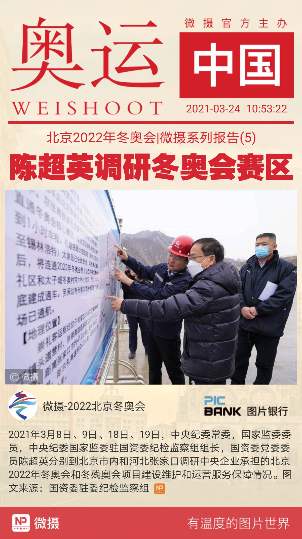 2021年3月8日、9日、18日、19日,中央纪委常委,国家监委委员,中央纪委国家监委驻国资委纪检监察组组长,国资委党委委员陈超英分别到北京市内和河北张家口调研中央企业承担的北京2022年冬奥会和冬残奥会项目建设维护和运营服务保障情况。