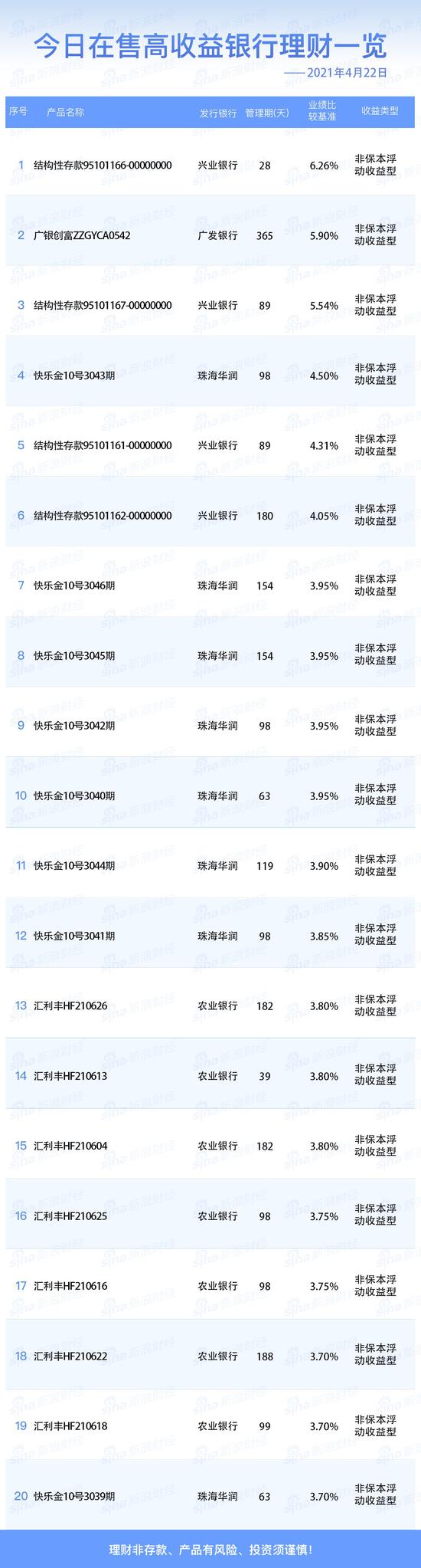 •   新浪财经4月22日在售高收益银行理财产品:今日业绩比较基准在5%以上的银行人民币理财产品共3款。兴业银行“结构性存款95101166-00000000”业绩比较基准最高,为6.26%。