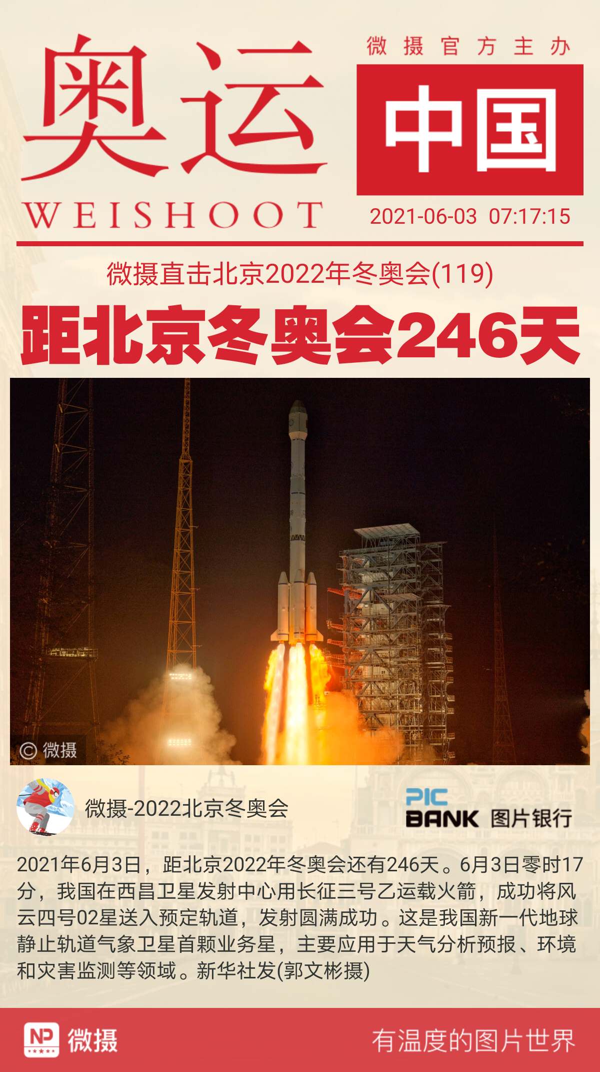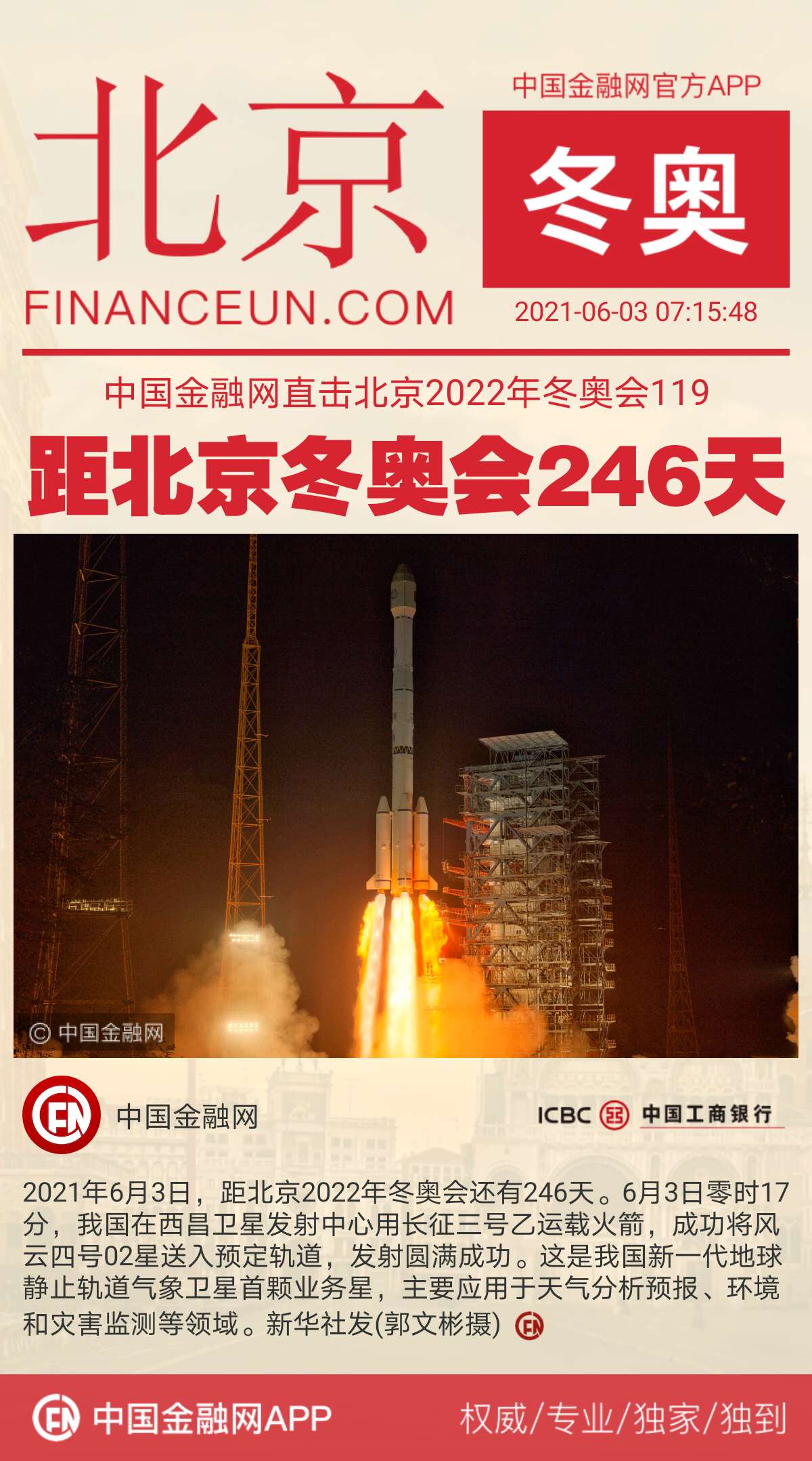 2021年6月3日,距北京2022年冬奥会还有246天。6月3日零时17分,我国在西昌卫星发射中心用长征三号乙运载火箭,成功将风云四号02星送入预定轨道,发射圆满成功。这是我国新一代地球静止轨道气象卫星首颗业务星,主要应用于天气分析预报、环境和灾害监测等领域。